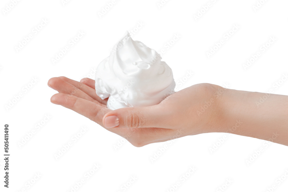 white bubbled foam in hands, hair foam, foam for man, white textured, hand full of soap isolated on white background