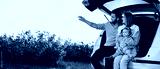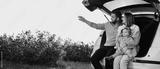 Young Caucasian Family Sitting in the Trunk of SUV Car, Mom and Dad with Baby Daughter Having Fun Time on Weekend Outdoors, Copy Space