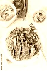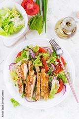 Salad with grilled chicken breast. Fresh vegetable salad with chicken meat. Healthy lunch menu. Diet food. Top view, flat lay