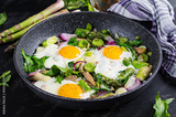 Fried eggs with asparagus, leeks, spinach and mushrooms. Useful breakfast.