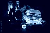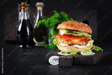 Hamburger with chicken burger meat, cheese, tomato, cucumber and lettuce on wooden background. Tasty burger. Close up