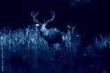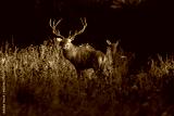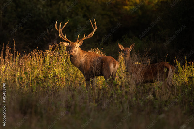 red deer, cervus elaphus, stag and hind standing on a meadow illuminated by evening sun and looking into the camera. Two wild mammals in tall grass partially hidden in shadow with copy space.