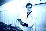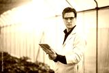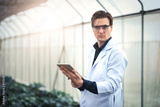 Portrait of handsome agricultural researcher holding tablet while working on research at plantation in industrial greenhouse