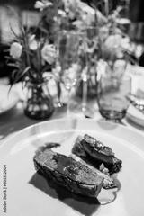 Vertical shot of a fine dinner in a Michelin restaurant in London with flowers in the background