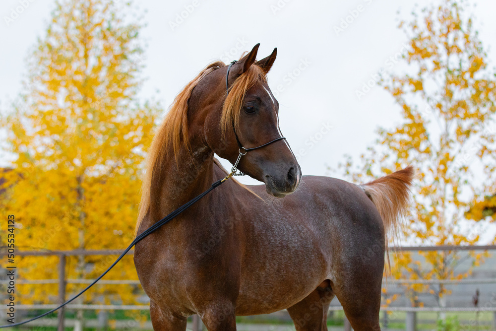 Beautiful chestnut arabian horse looks back on natural background, portrait closeup