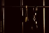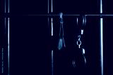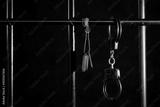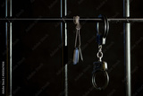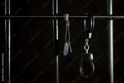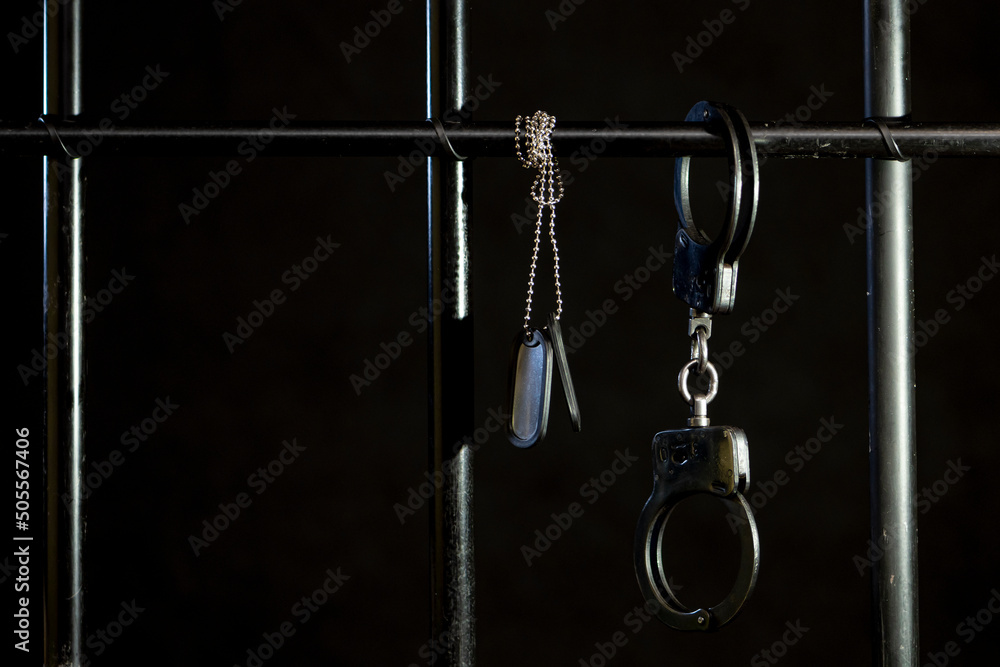 Police handcuffs fastened to the bars of a prison cell on a dark background, army identification badge, selective focus. Concept: the trial of a serviceman, a war crime.