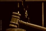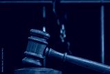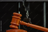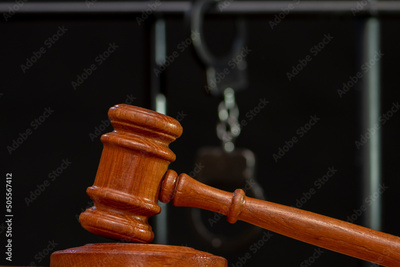 The judge's wooden hammer for sentencing against the background of bars and handcuffs. Concept: court session, trial, sentencing.