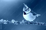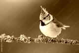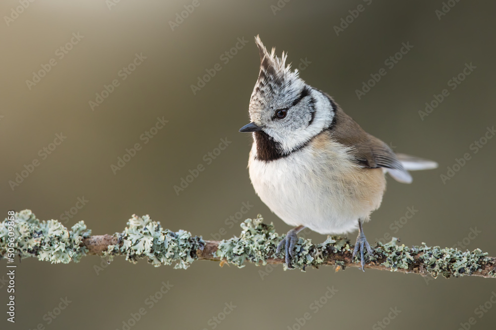 Single crested tit, lophophanes cristatus, sitting on branch with lichen in spring forest at sunrise. One bird with a standing feathers on its head resting on a twig illuminated from behind.