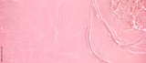 Abstract summer banner background Transparent pink clear water surface texture with ripples, splashes. Water wave in sunlight, copy space, top view. Cosmetics moisturizer micellar toner emulsion