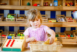 Little preschool girl play with food and grocery wooden toys. Happy active child playing role game as cashier or seller, in wood shop or supermarket. Education, activity for kids.