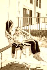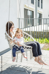 Happy mom and little baby girl are swinging on swing chair in backyard of house.