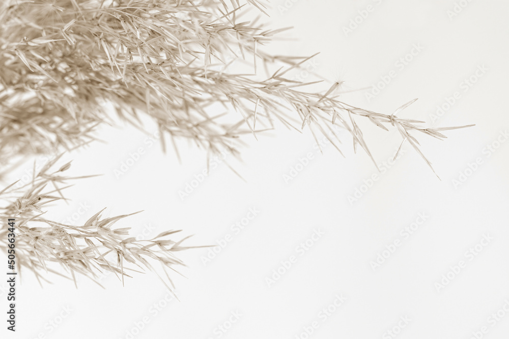 Dry reed rush cane golden heads with fluffy buds on light background macro and place for text beige retro vintage neutral effect