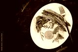 Fried egg with asparagus, tomato and bacon. Useful breakfast. Top view, overhead