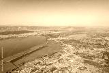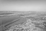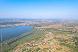 Lake, village, townhomes, forest in the mountain. Drone view, aerial view, top view
