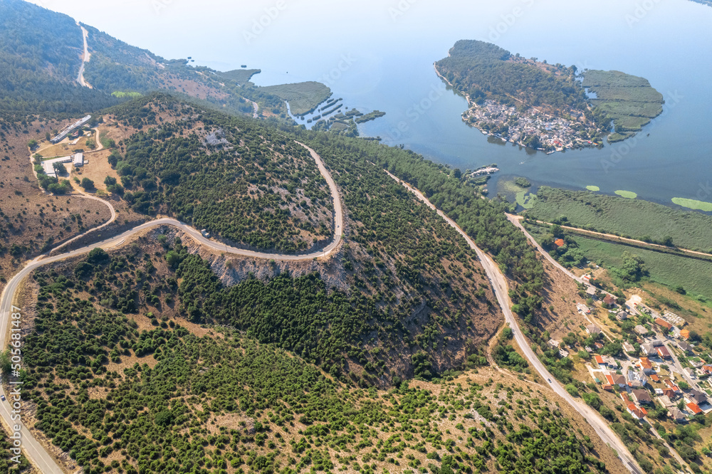 Meandering serpentine road in the mountain with lake and small islad. Aerial view. Copter, drone view