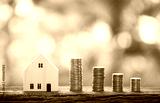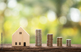 Model house and coins on wooden table natural blur background, home loan concept, purchasing a house, home mortgage, Concept house or investment property.