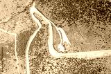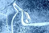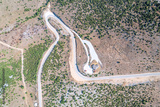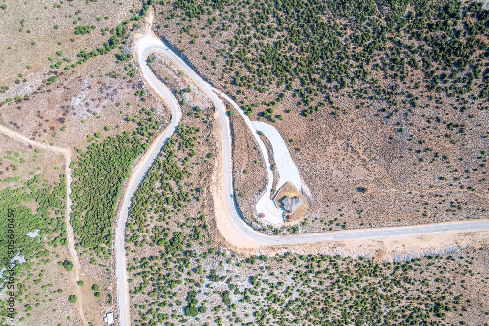 Meandering serpentine road in the mountain with small village house. Aerial view. Copter, drone view