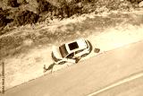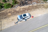 Woman standing by broken down car with open hood at countryside road. Aerial, top, drone view