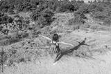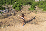 Happy tourist traveler girl with a backpack spreading her arms standing on the top of the mountain. Freedom, hope, peace concept