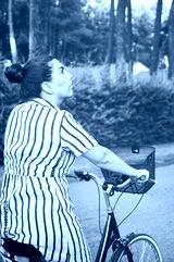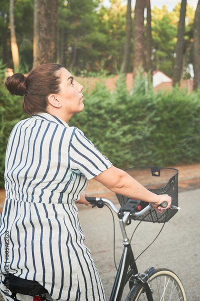 Young adult woman with a bow in her hair and a striped dress enjoys a beautiful summer day riding a bike. She walks enjoying the view.