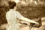 Young adult woman with a bow in her hair and a striped dress enjoys a beautiful summer day riding a bike. She walks enjoying the view.