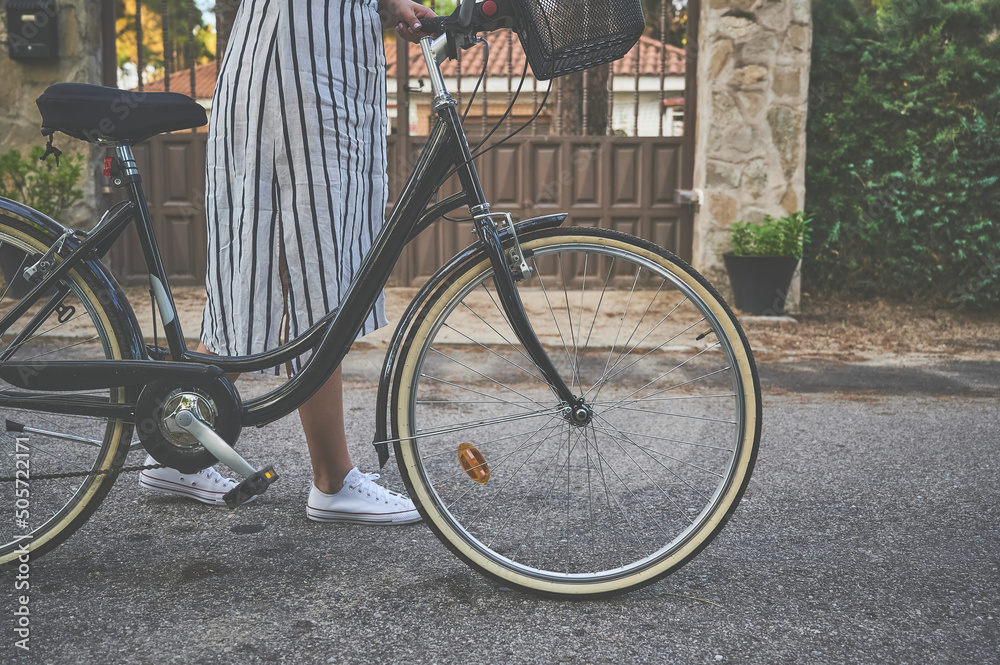 Detail of the bike's front tire. Young adult woman with a bow in her hair and a striped dress enjoys a beautiful summer day riding a bike.