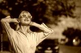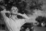 Happy smiling fashionable woman wearing trendy yellow rectangle sunglasses, classic pink shirt, posing in street of city. Copy, empty space for text