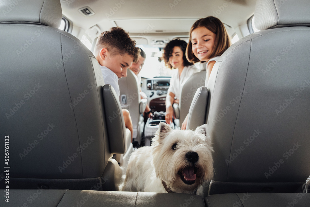 West Highland White Terrier Dog in Focus and Blurred Four Members Family Traveling by Minivan Car, Mother and Father with Two Teenage Children and Pet on a Weekend Road Trip