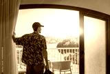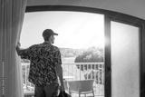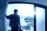 Tourist man in the hotel bedroom with her luggage standing near the window. Travel and vacation concept.