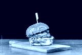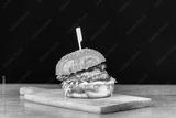 Close-up of delicious fresh home made burger with lettuce, cheese, onion and tomato on a wooden plank on a dark background