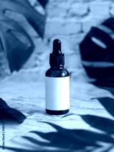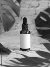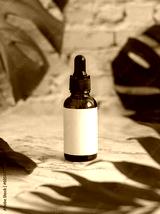 Dropper Bottle on monstera leaf on marble table close up. Brand packaging mockup