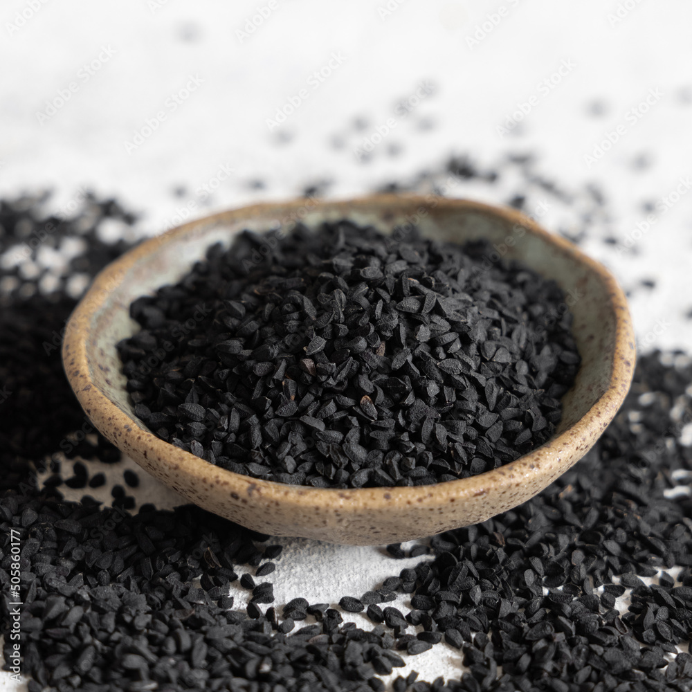 Indian spice Black cumin (nigella sativa or kalonji) seeds in bowl close up