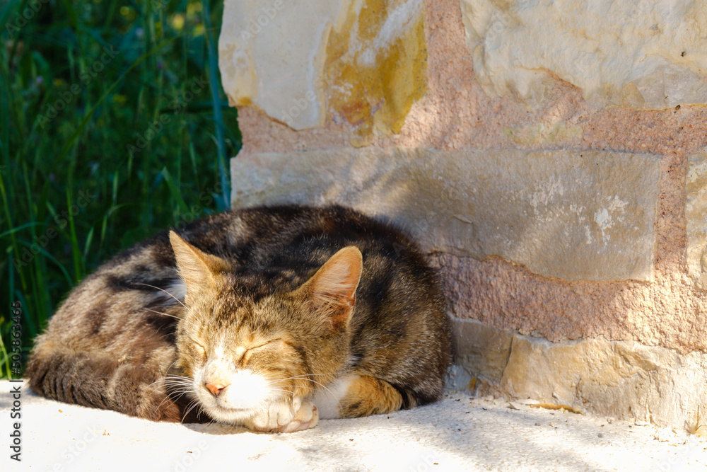 Cat lying and sleeping on the stone ground background. Beautiful young brown and white cat. High resolution photo for large displays and prints.