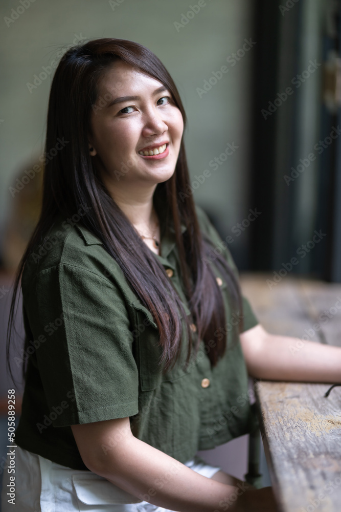 a portrait of beautiful happy asian woman traveler wearing brownish green dress stylish hipster Summer sunny lifestyle in coffee shop like the background