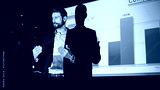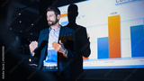 Conference Business Meeting Presentation: CEO Businessman Shows Data to Group of Investors, Businessspeople. Projector Screen Shows Graphs, Product Sales, Revenue Growth Strategy, e-Commerce Analysis