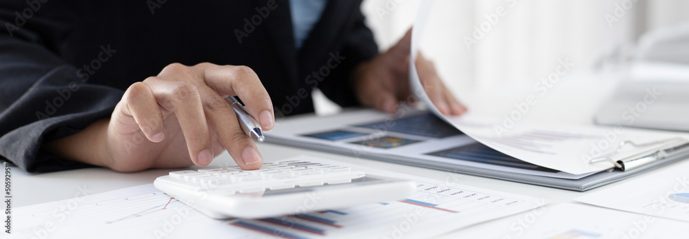 Accounting businesswomen are calculating income-expenditure and analyzing real estate investment data, Dedicated to the progress and growth of the company, Financial and tax systems concept.