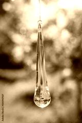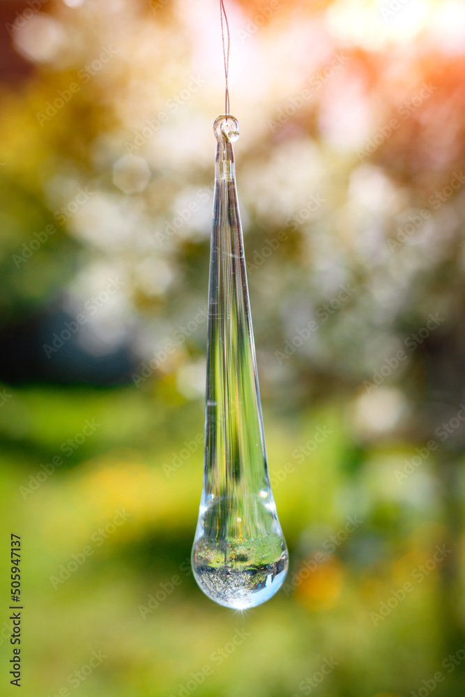 large transparent drop on the background of a blooming apple orchard with a hand. The concept of water protection, ecology of the planet