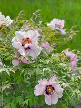 Beautiful pink peony flowers bush against green grass in garden.