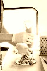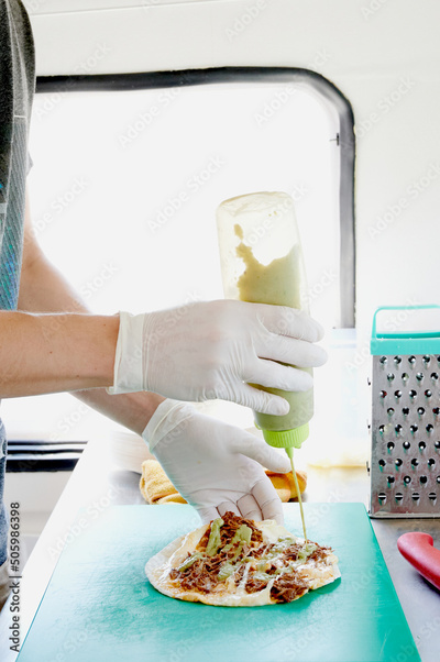Inside a food truck kitchen, take away food concept. Chef prepares a Mexican cochinita pibil quesadilla order to take away adding chili hot sauce dressing. Street food.
