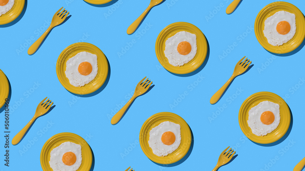 A pattern of fried eggs in a yellow plate and yellow forks on a blue background. Minimal concept.