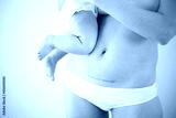 Mom's abdomen after cesarean section. Scar seam. A young mother holds the baby in her arms. Real motherhood. Lifestyle