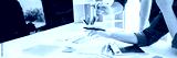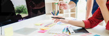 Two Graphic designer Brainstorming Meeting and drawing on graphics tablet at workplace