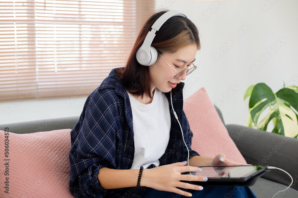 Happy Asian glasses girl listening music from tablet computer in living room at home. Recreation at home concept.