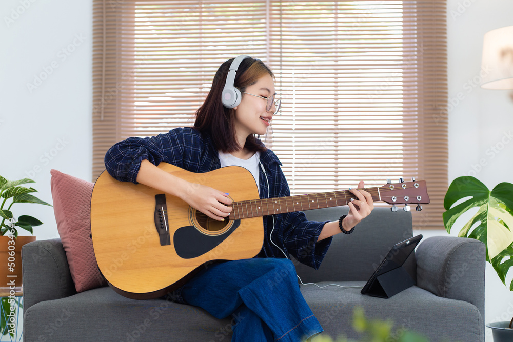Happy Asian glasses girl playing acoustic guitar and listening music from tablet computer in living room at home. Recreation at home concept.