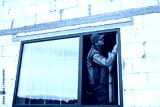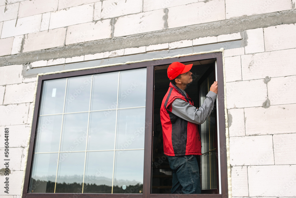 The window installer adjusts the hinges and checks new windows in the cottage under construction. Ordering windows with golden layout and brown lamination for a private house. A worker in uniform