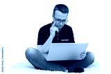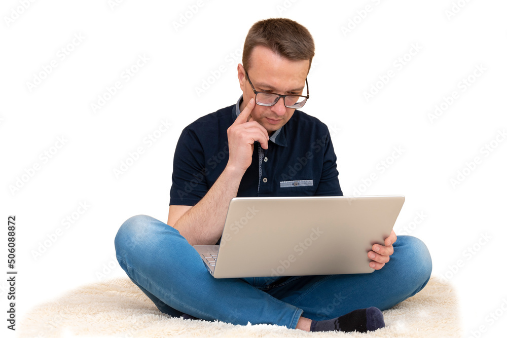 A young man with glasses thoughtfully reads and looks at a laptop, isolate.