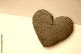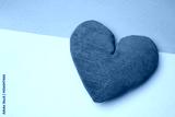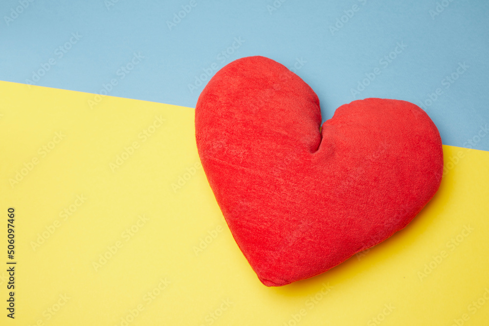 Red heart on blue and yellow papers like symbol with love for Ukraine. View from the top.
