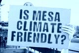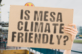 The question " Is Mesa climate-friendly? " is on a banner in men's hands with blurred background. Support. Team. Activist. Urban. Sunset. Carbon. Ecology. Energy. New. Clean. Warming. Waste