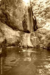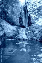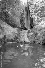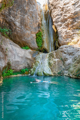 Young happy woman floating in turquoise blue crystal clear water in the river with a waterfall summer vacation relaxing body and mind.