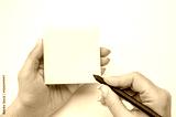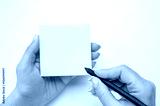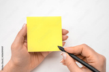 Mockup sticky Note Paper. Hand written notes black pencil on yellow sticker. white table background. Mockup sticky Note Paper. empty sheet for notes. female hand holding note paper and making note